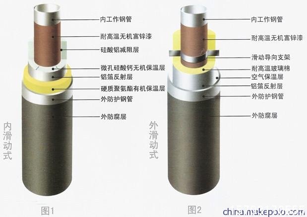 內滑動由于使用了保溫性能優良的有機保溫材料,如聚氨酯,保溫效果好,外表面溫度較低,對鋼制外護管的內滑動結構,除保溫良好外,還具有強度高,密封性能好,接口強度 高,不用打固定支座等優點,但該結構造價高。