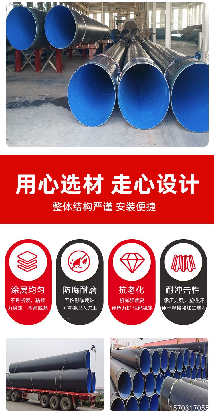 外 3PE 內(nèi)環(huán)氧粉末防腐螺旋鋼管在輸水用途上展現(xiàn)出眾多卓越性能。其防腐性能極為強大,能夠有效抵御各種化學(xué)物質(zhì)的侵蝕,使用壽命長達(dá) 50 年以上。例如,外 3PE 防腐技術(shù)已有近 70 年歷史,內(nèi)涂層的環(huán)氧粉末也有 50 年使用歷史,充分證明了其在防腐方面的可靠性。